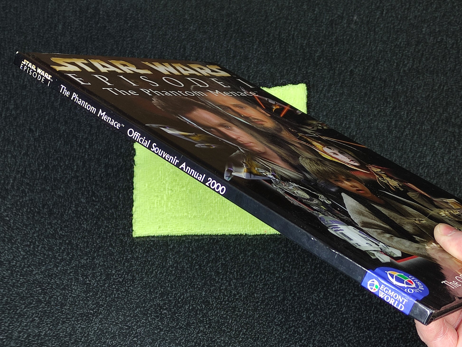 - This hardcover is a collector’s book published for the 2000 release of The Phantom Menace, the first film in the Star Wars prequel trilogy. Produced by Egmont Books in the UK, this annual features an abridged retelling of the movie’s story with images taken directly from the film, along with character profiles, detailed looks at key space and flying vehicles, and entertaining quizzes. Designed for fans and younger readers, it’s packed with vibrant visuals and accessible content celebrating the new heroes, villains, and worlds introduced in Episode I. This volume serves as both a keepsake and an introduction to The Phantom Menace, capturing the excitement and spectacle of one of the most highly anticipated movie events of its time.
