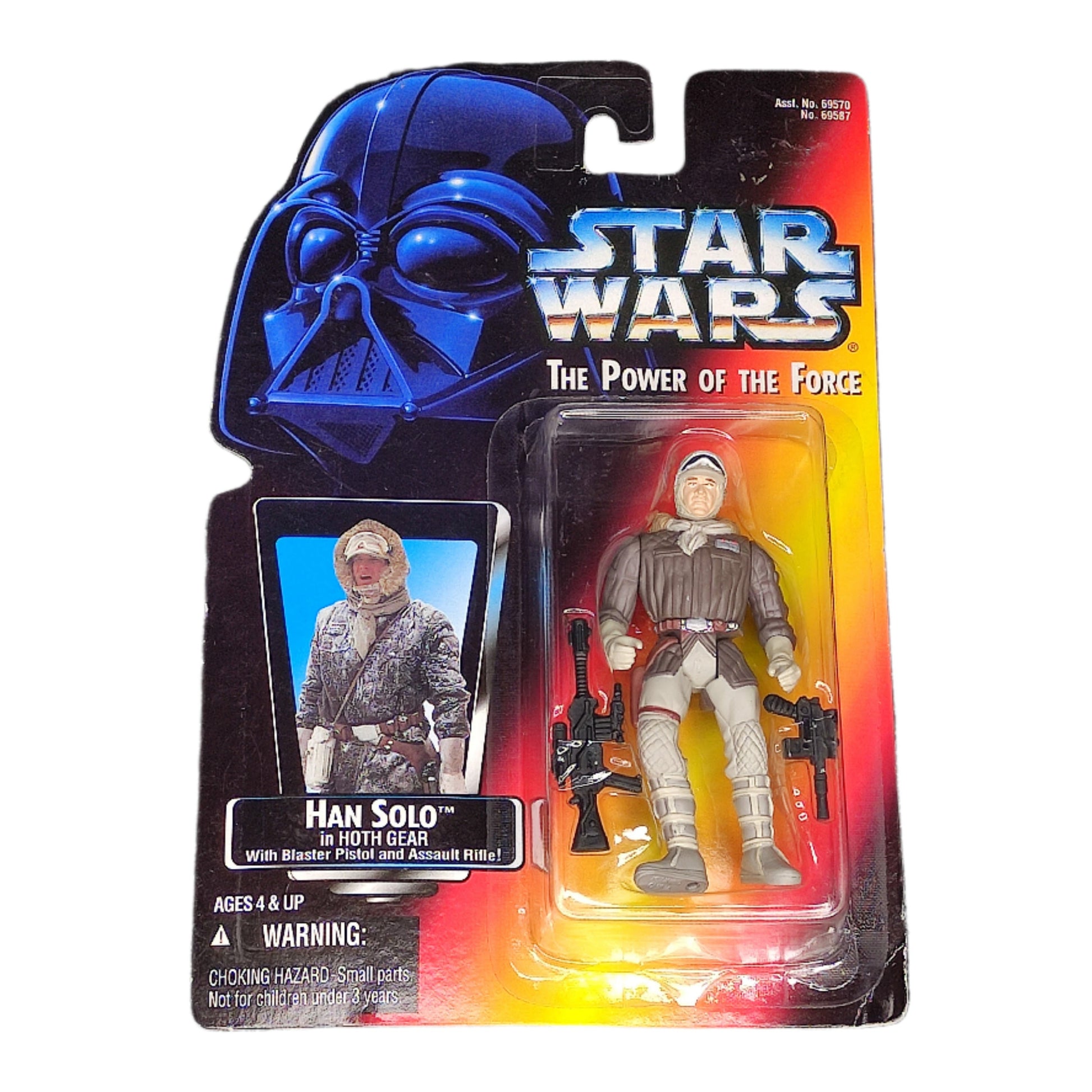 - This vintage action figure is from the Power of the Force range. It features Han Solo in his iconic cold-weather outfit from The Empire Strikes Back and includes a blaster accessory. Standing approximately 3.75 inches tall, it has the distinctive muscular sculpt of the early POTF figures. A great addition for Star Wars fans and collectors of vintage action figures.