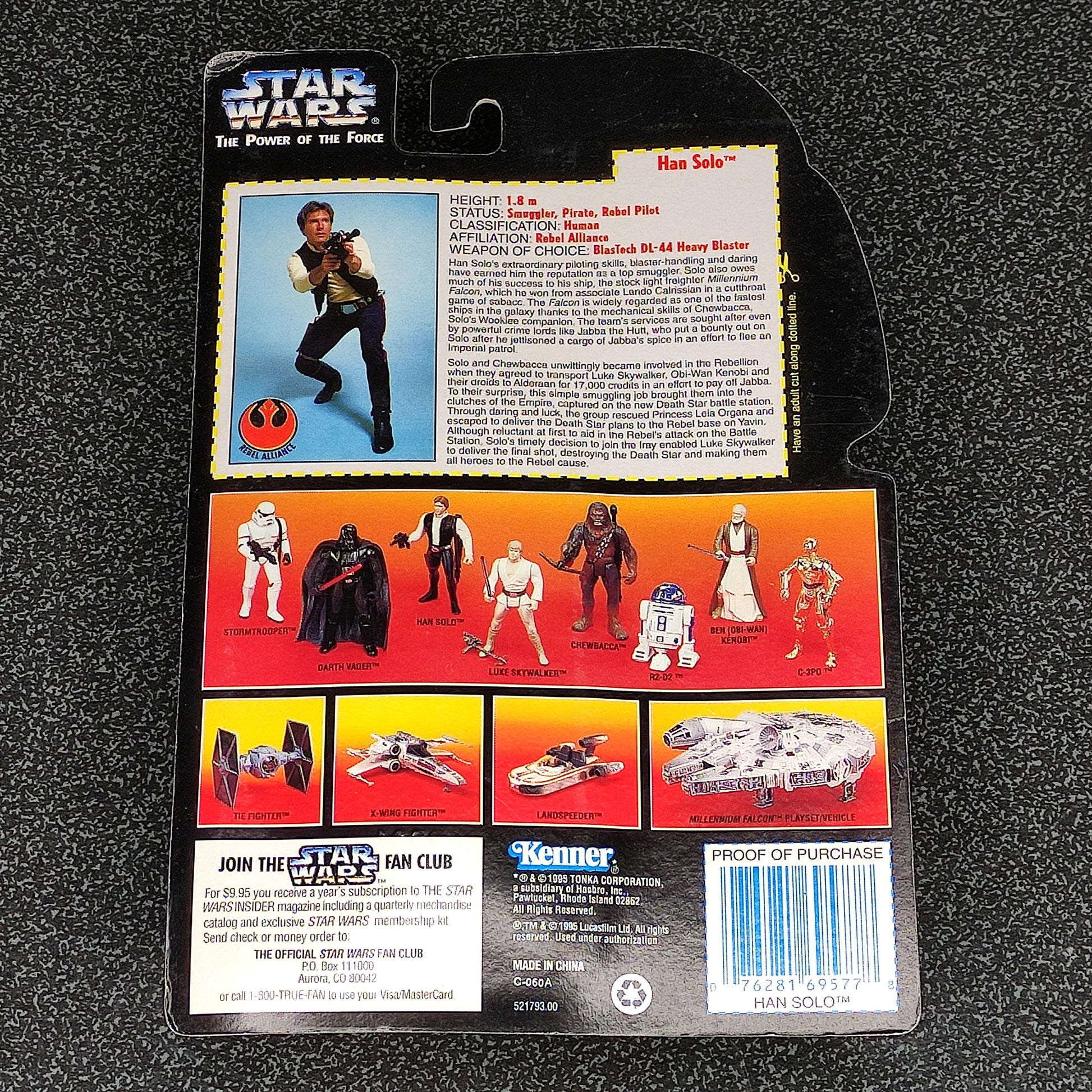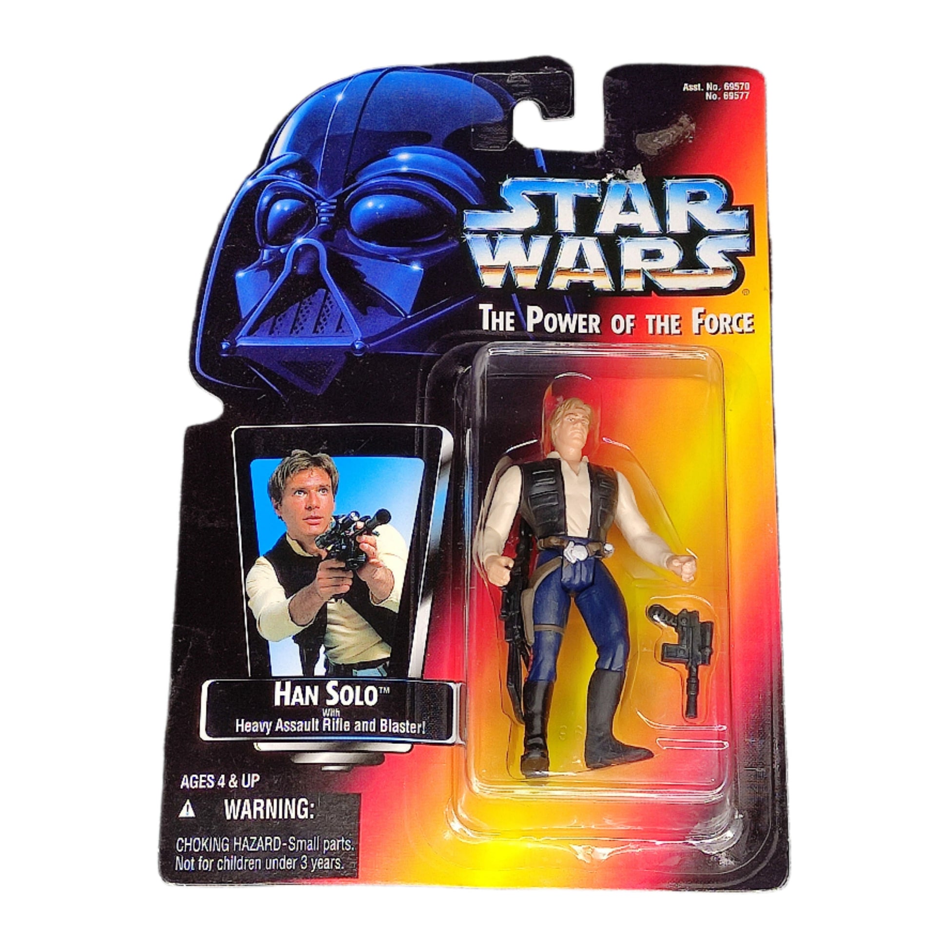 - This action figure is from the Power of the Force range, featuring Han Solo with a heavy assault rifle and blaster. This figure showcases Han in his classic outfit from the original trilogy and comes equipped with both his iconic blaster and a large heavy assault rifle accessory. Standing approximately 3.75 inches tall, it features the distinctive muscular sculpt typical of early POTF figures. An excellent addition for Star Wars fans and collectors of vintage action figures.